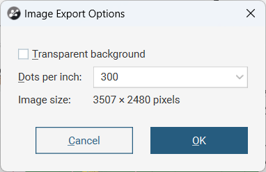 If the export format is selected as a GeoTIFF file, an Image Export Options window will appear where the resolution can be specified in Dots per inch and you can specify whether or not the image will have a Transparent background.