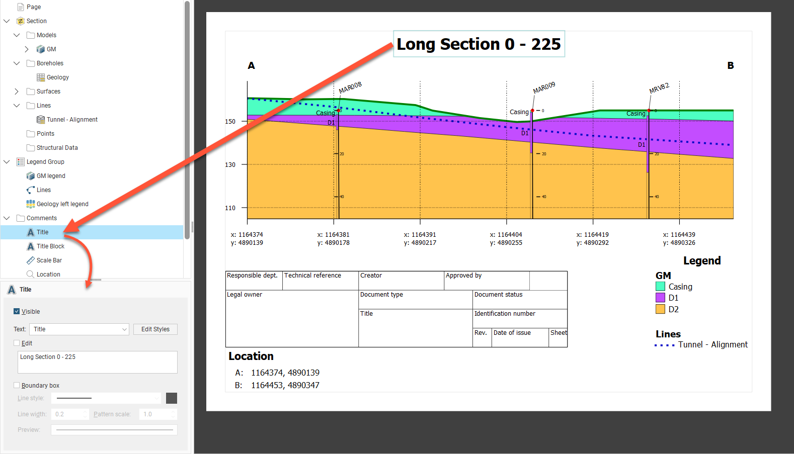 When you select an object in the layout tree, it will be highlighted by a blue line on the page. In the example above, the Lines object Tunnel - Alignment is selected. Click on an object in the page preview to move or resize it. This will also select the object in the layout tree and you can see what properties can be changed. For example, in the preview, click on the Title to view its styling options:
