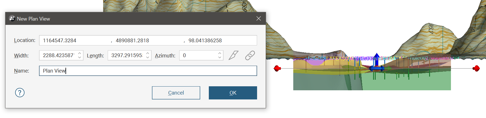 If there is no existing plan view, first add a model to the scene and press the D key to get a top-down view of the model. Next, right-click on the Sections, Plans and Contours folder and select New Plan View. The New Plan View window will appear, together with a plan view plane and controls in the scene that let you adjust the position of the plan view plane: