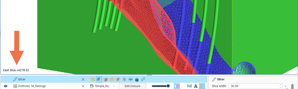 When the slicer is in the scene and the slice is aligned with the x-, y- or z-axis, text describing the slicer position can be displayed in the lower left-hand corner of the scene: