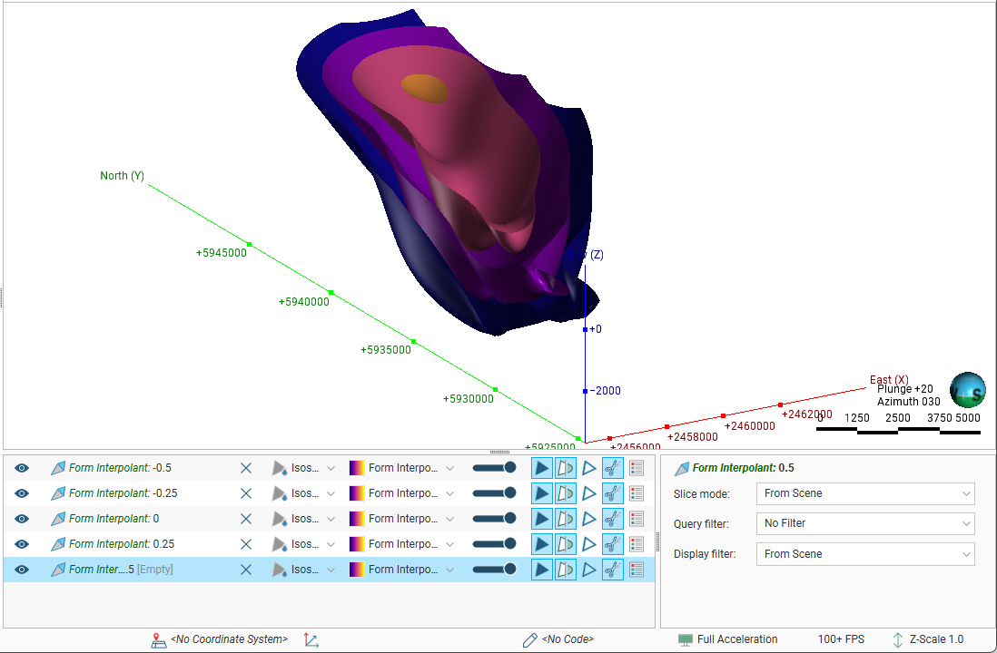 A form interpolant is an RBF interpolant that uses planar structural data to control the RBF gradient. The RBF gradient resembles the geology orientation, which makes form interpolants useful for visualising structural data and identifying broad trends in 3D. The form interpolant’s meshes can then be used to control other surfaces in the project.