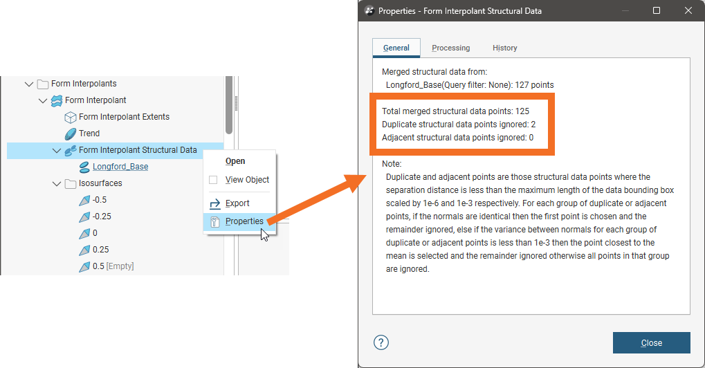 To view information about the data used for the form interpolant, right-click on the structural data object (
