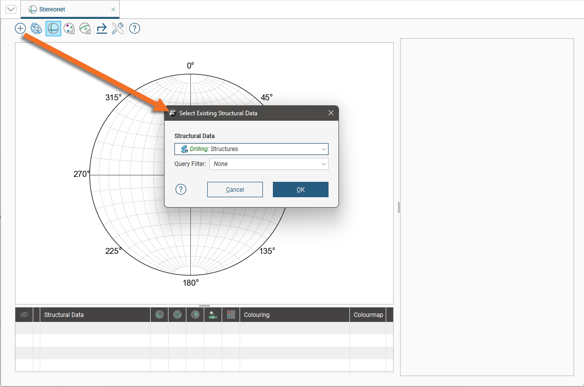 Create a stereonet by right-clicking on the Stereonets folder (in the Structural Modelling folder) and selecting New Stereonet. The stereonet is created and opened in a new tab. Click the Add button (