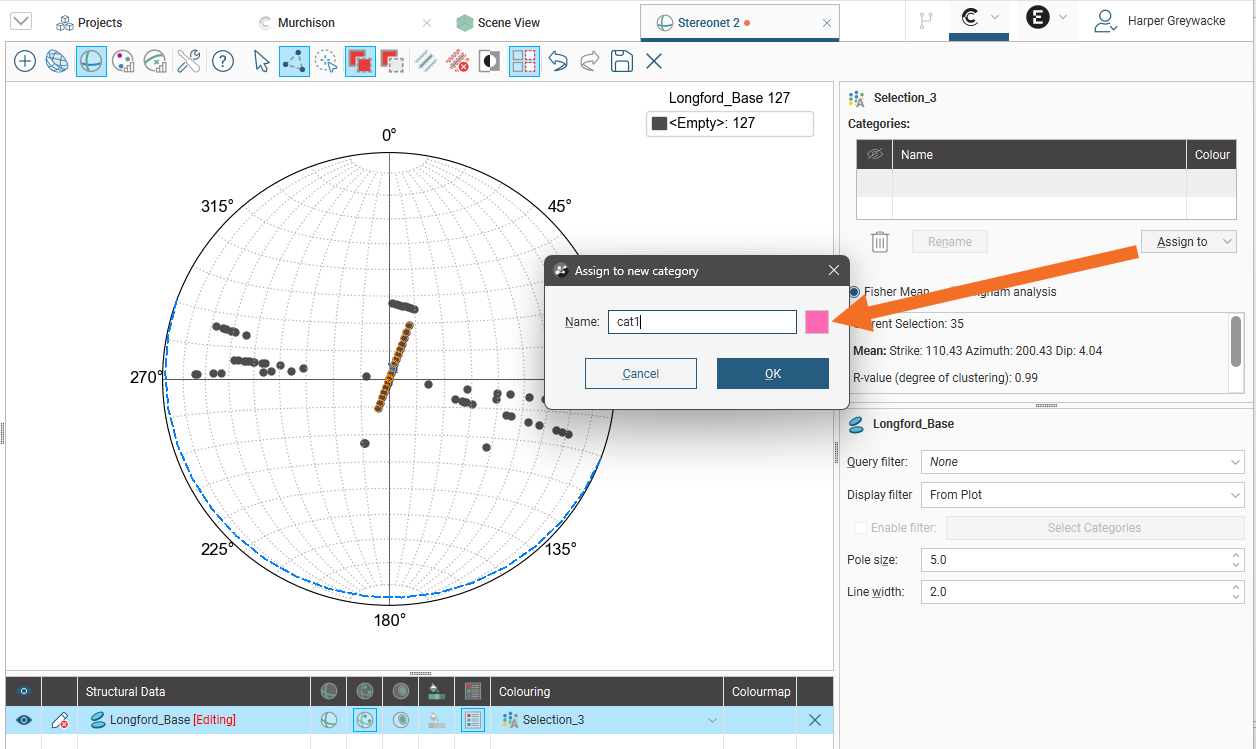 Once you have selected a set of points, click the Assign to button in the stereonet window, then select Create New Category. In the window that appears, enter a name for the category and assign a colour: