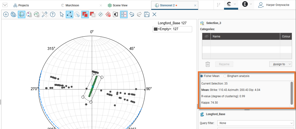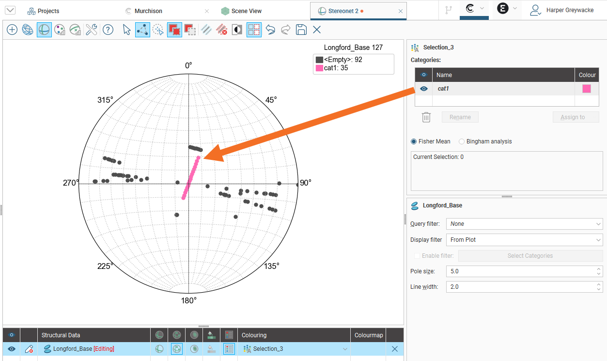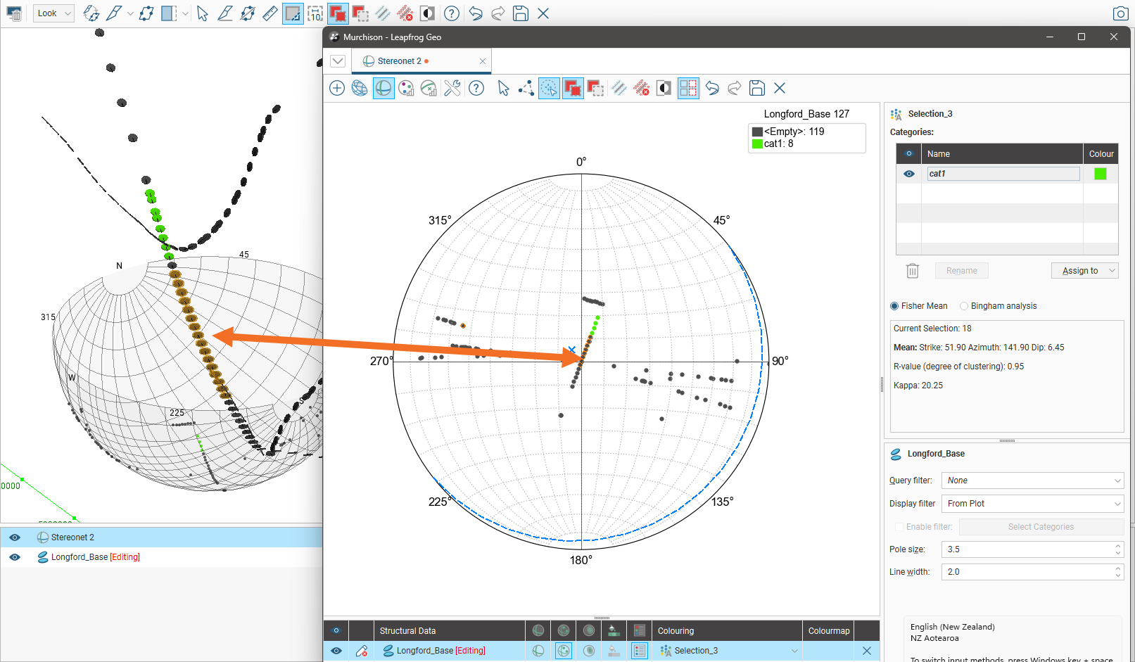 Controls for assigning points to categories will remain in the stereonet window, and both the stereonet window and the scene window will be updated to reflect the selected and assigned points.