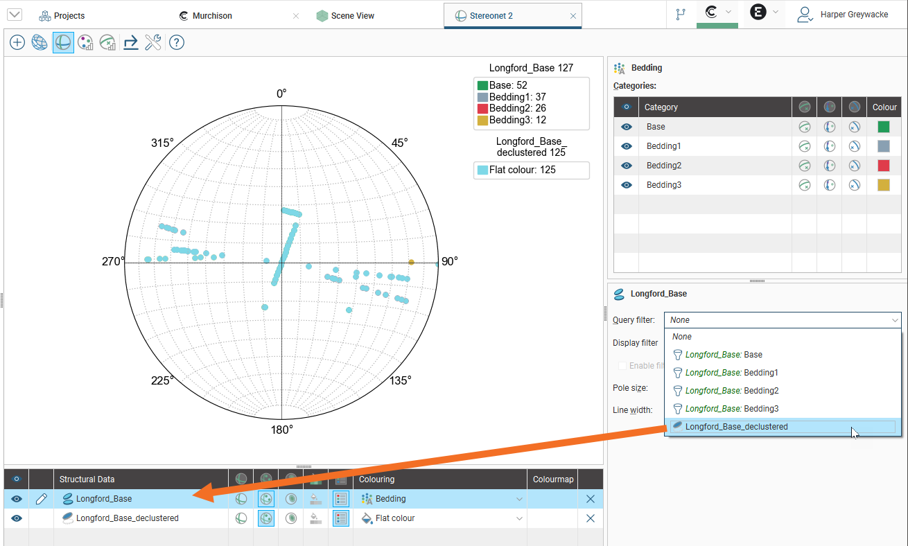 - If the declustered data’s parent data table is displayed on the stereonet, the declustered data is available as a filter.