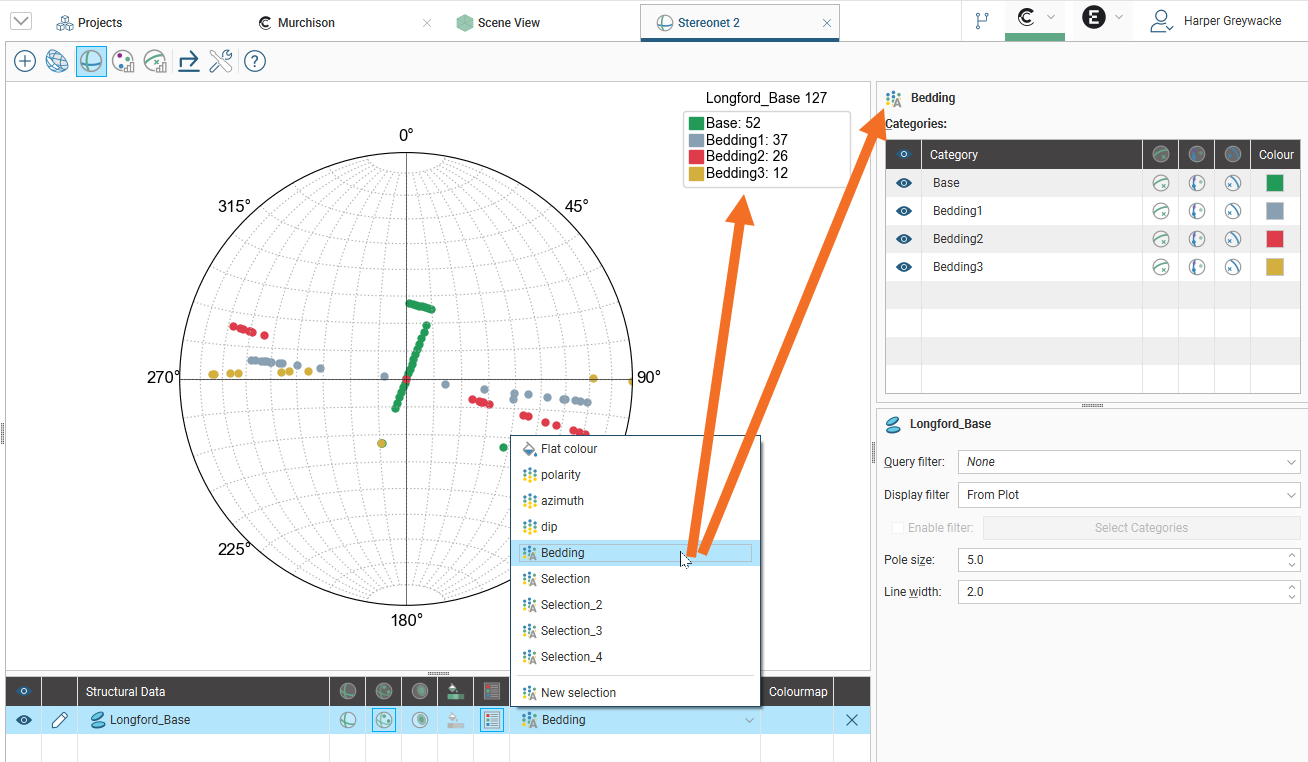 ). The stereonet’s legend is generated from the categories that are visible in the list of colourings. Here, the categories displayed are from the Bedding column: