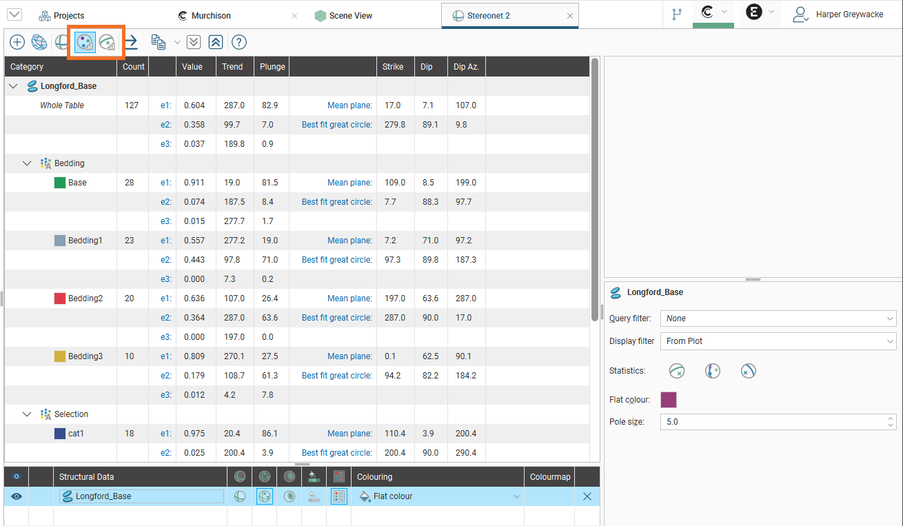 ), using the colouring from any column in the structural data table. Lineations can be displayed as poles (