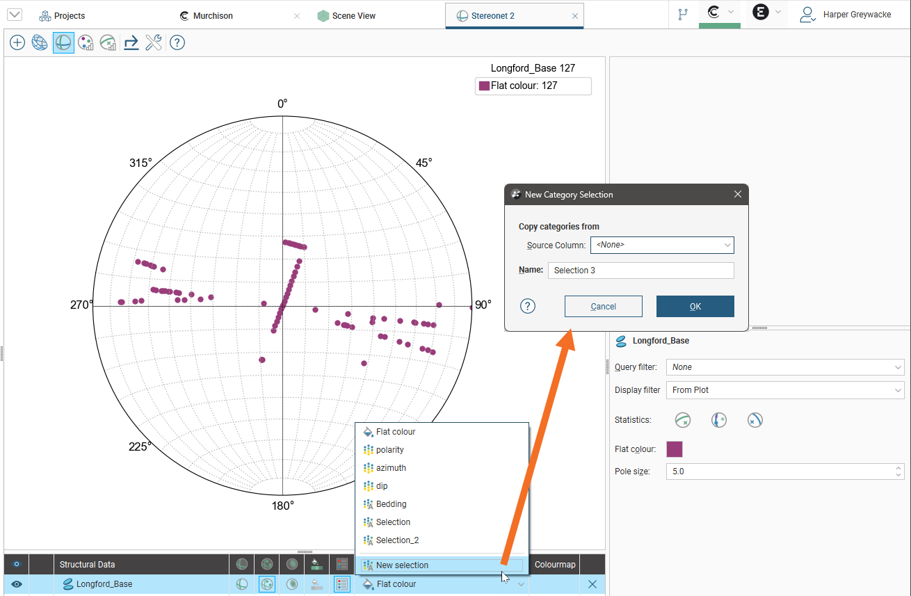 You can select data in the stereonet and assign it to new categories or existing ones. To do this, click on the data table in the stereonet window and select New selection from the colouring list: