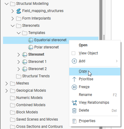 Note that the settings in Edit plot options window only apply to the current stereonet. If you want to create a stereonet “template” for your project, you can create a new stereonet with different plot options and make copies of it in the project tree: