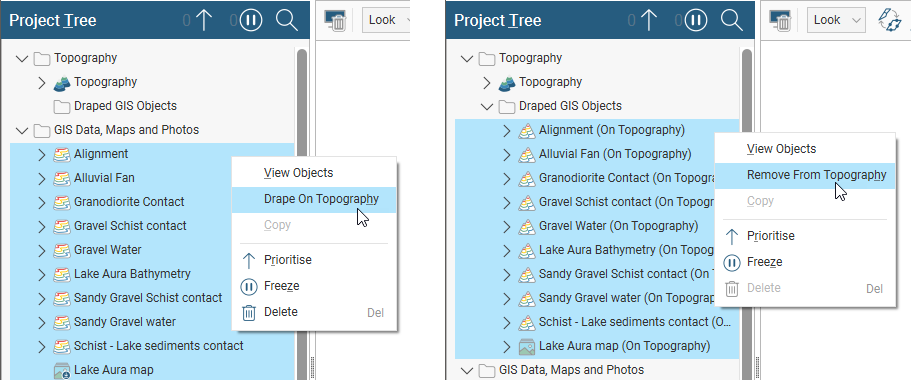 - GIS objects. This lists all GIS data objects stored in the GIS Data, Maps and Photos folder that have been draped on the topography.