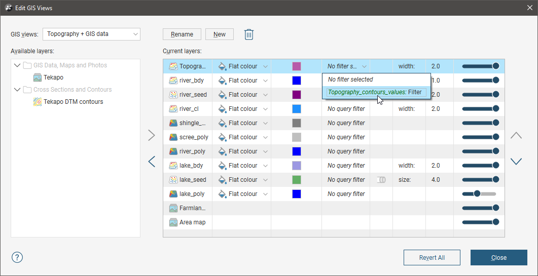 - Views. This contains options for creating and editing custom topography views and also lists any views already defined. With custom topography views, you can view multiple GIS objects, maps and contours. See Custom Topography Views below for more information.
