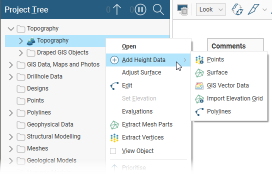 The topography can be created from an imported elevation grid, points data, surfaces and GIS data. You can also set a fixed elevation, if you do not have any data suitable for creating a topography. Once the topography has been defined, additional height data can be added by right-clicking on the topography and selecting from the options available. See Adding Height Data to the Topography for more information.
