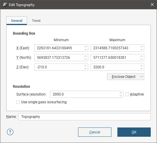 When the topography is created from points or GIS data or when the topography is created by combining data, you can change its boundary and resolution and apply a trend. To do this, double-click on the topography in the project tree. The Edit Topography window will appear: