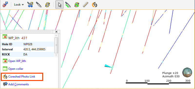 To view core photos, click on a drillhole in the scene, then click on the Coreshed Photo Link button in the window that appears: