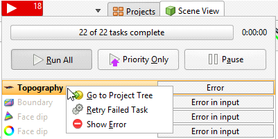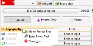 If processing of an object fails, all other objects dependent on that object will also fail. Click the processing queue button to view the errors. To inspect the source of error, right-click on the object in the task queue and select Go to Project Tree > Show Error: