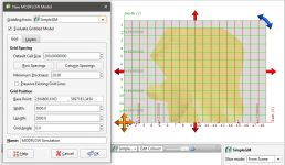 To create a new MODFLOW model, you must first have at least one geological model defined in the project. Once this has been defined, add the geological model to the scene. Right-click on the Hydrogeology folder and select MODFLOW > New Structured Model. The New MODFLOW Model window will be displayed, together with controls in the scene that will help you to set the grid extents: