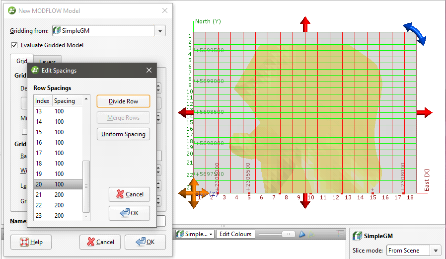 By default, the horizontal grid for the model is uniform, with the size of each cell set by the Default Cell Size value. You can change the horizontal grid by editing row and column spacings. When you click on Row Spacings or Column Spacings, the Edit Spacings window will be displayed: