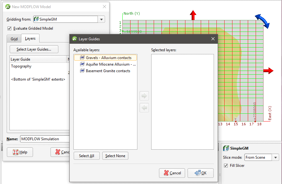 The new MODFLOW grid will be based on the geological model in the Gridding from setting. If you wish to use a geological model other than the one selected when the window is opened, select it from the list. The grid dimensions will be updated in the scene.