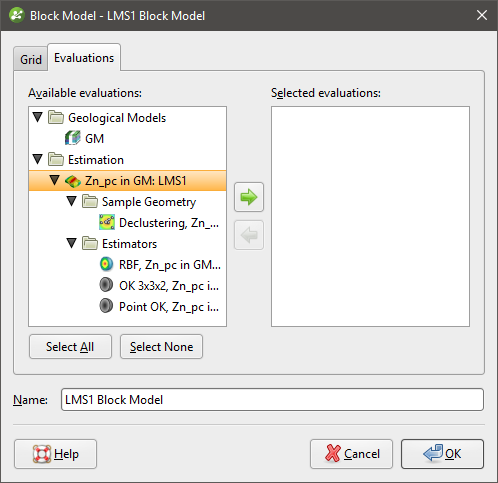 You can add all of, for example, a domained estimations sample geometries and estimators to the Selected evaluations list by double-clicking on the domained estimation itself.