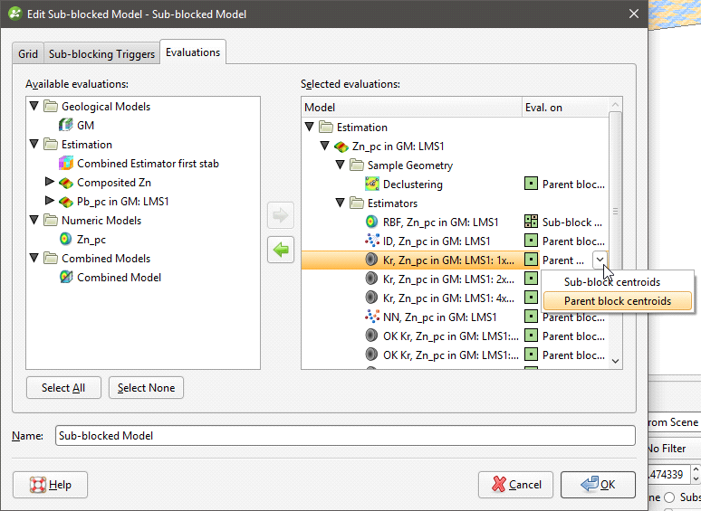 When selecting evaluations on a sub-blocked model, you can evaluate onto the parent block centroids or the sub-block centroids: