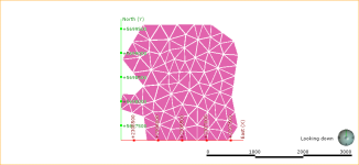 The Simplify boundary option reduces the number of points along the boundary. Reducing the Tolerance value increases the number of points along the boundary. The two settings together let you define a basic boundary with elements that are roughly uniform in size, set by the value of Element size. Here, a grid has been created from a geological model with the Simplify boundary option enabled: