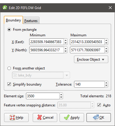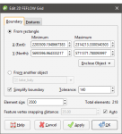 The Element size setting determines the basic size of the triangles that make up the grid, although the size will vary according to features applied to the grid and the Feature vertex snapping distance. The size will also vary if the Simplify boundary option is unticked, in which case the Element size setting is the maximum size of the triangles.