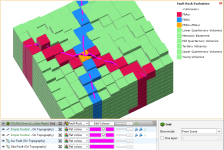 A faulted rocktype evaluation is based on the fault system of the model associated with the TOUGH2 model. For TOUGH2 models created in Leapfrog Geothermal, the faulted rocktype evaluation is automatically created when the TOUGH2 model is defined; for imported TOUGH2 models, the evaluation is created when rocktypes are generated for the model.