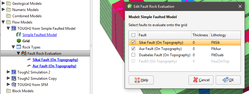 In this example, one fault (Duabelas) is disabled in the TOUGH2 model, whereas the greyed out fault (Fault3) is disabled in the geological model itself.