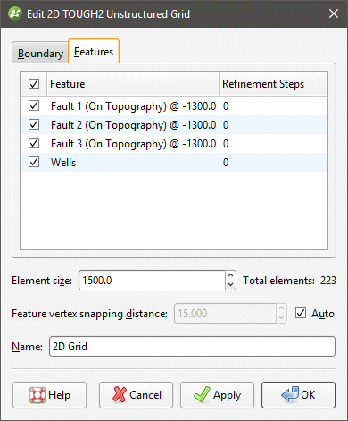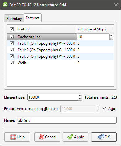 You can edit the feature by double-clicking on it or by right-clicking and selecting Open. However, the feature has not yet been applied to the grid. To enable the feature, double-click on the grid to open the Edit 2D TOUGH2 Unstructured Grid window. Tick the box to enable the feature, then adjust the number of Refinement Steps: