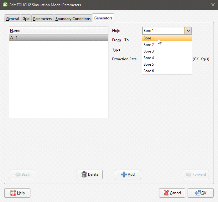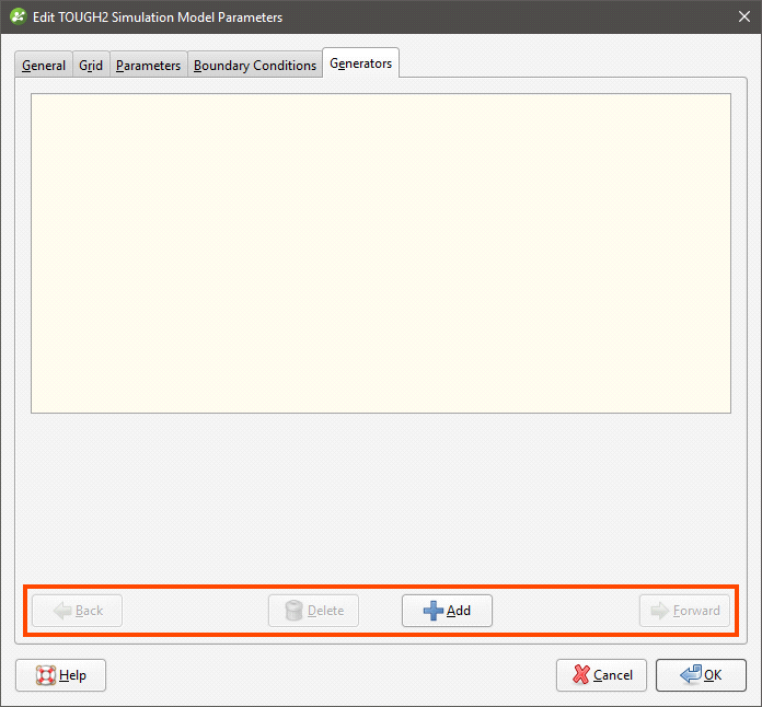 In the other tabs, you can set TOUGH2 parameters and boundaries and define generators based on screens.
