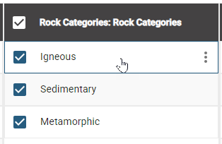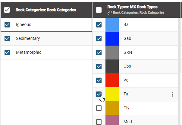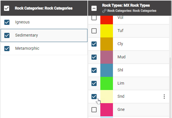 To include the items in the list tick the box of the list times you want associated with it. Here we have selected Igneous and the Rock Types that are relevant to it:
