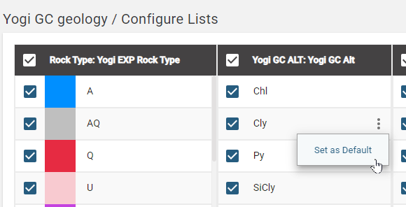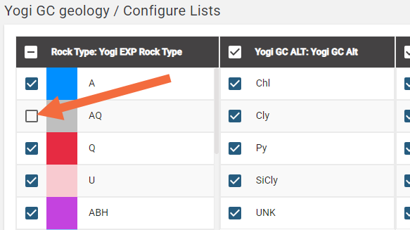 If you are using a list for an activity but not all values in that list are relevant for the activity, you can disable some values for the activity. For example, you may have a master list of rock types that contains hundreds of different codes. You can turn off the codes that are not relevant to that activity, shortening the list loggers must choose from.