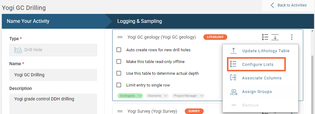 Once your master lists have been configured, you can customise how they are used in specific activities. This streamlines the data entry process for loggers.