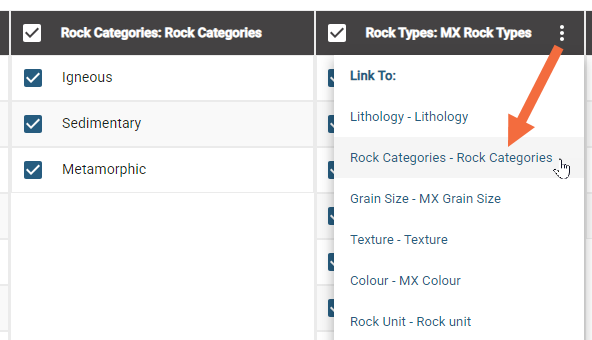Click the overflow menu on the column you wish to link. Here we have chosen to link the Rock Types list to the Rock Categories list.