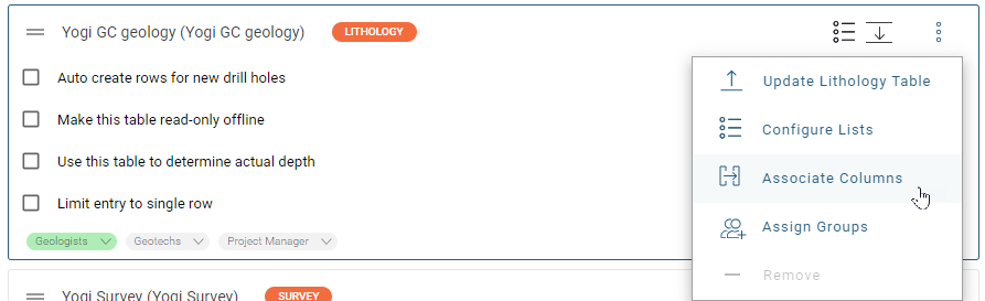 Using associated columns achieves a similar effect to using cascading lists but in a different way. When you create a cascading list, it links only two columns and filters the list items based on what value is selected in the initial column. Using associated columns gives you more flexibility in that it allows you to collect further detail for some values but not others. For example, you may want to capture two characteristics for all lithologies logged, e.g. grain size and texture. You would set these as common columns, and for background lithologies, these might be the only characteristics captured. But for mineralized lithologies, you may want to capture additional details, such as mineralization, alteration and mineralogy. Using associated columns allows you to customise the workflow in this way.