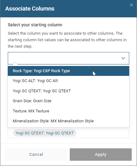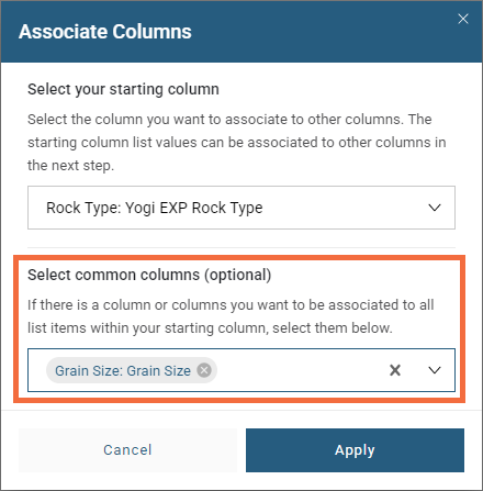 Next, choose any columns you want to associate with all values in the starting column. You would choose a column here if, for example, you wanted to capture more detail for every value in the Rock Type list. However, this step is optional. Here we have chosen to associate the Grain Size column, containing the MX Grain Size list, as a group of characteristics that we want captured for every rock type: