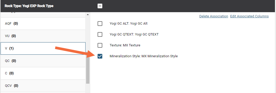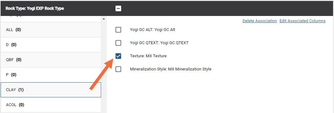 Here we have chosen the Texture column containing the MX Texture list to be associated with the CLAY rock type. When the logger selects clay, they will then need to choose an option from the MX Texture picklist.