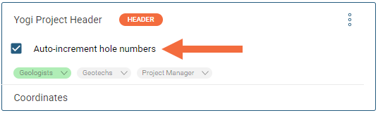 The Auto-increment hole/point numbers setting is available for the header table. This determines how each new logging activity is named. When selected, MX Deposit will automatically assign the first hole/point number with the prefix of MX.