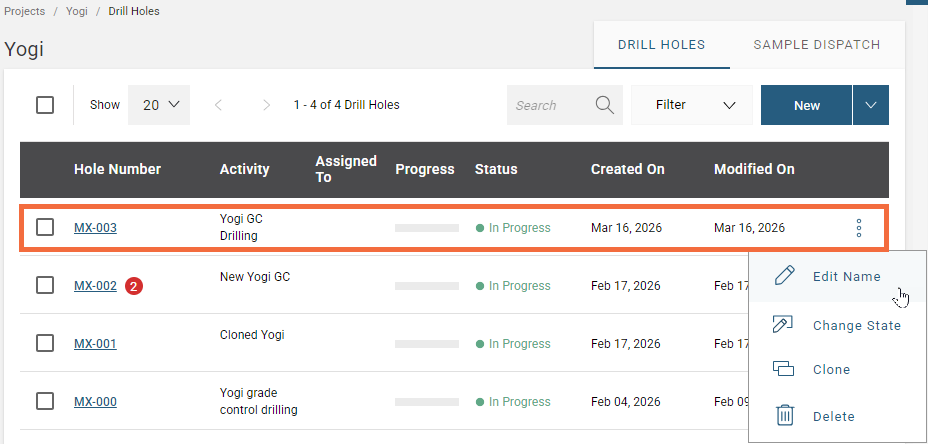 This can be changed once the hole is created and the status is set to In Progress. Here, the Hole Number assigned is MX-003. It can be changed by selecting Edit Name from the overflow menu of the new hole: