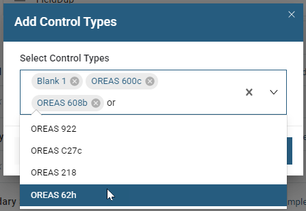 In the same way, click on the Add control types to add your reference material. In the window that appears, you can add multiple control types at once. You can search by scrolling or typing to dynamically filter as you type. Here we have added a blank and some standards: