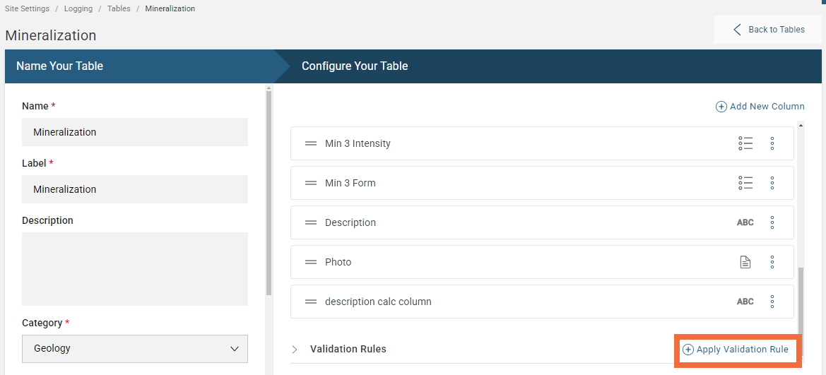 In this example, a validation rule is added to a table. Under the Configure Your Table step click Apply Validation Rule: