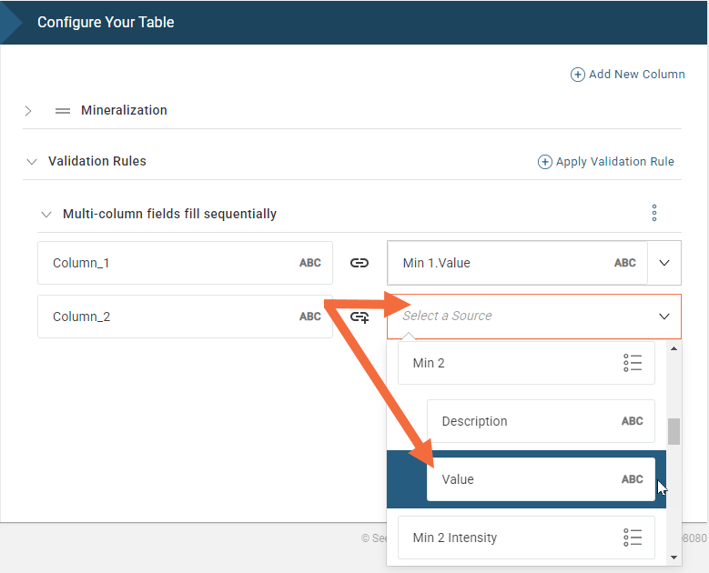 Next, map the validation inputs to a source in the table. In this example, the validation inputs, Column_1 and Column_2, are mapped to the values logged for the Min1 and Min2 columns of the Mineralization table: