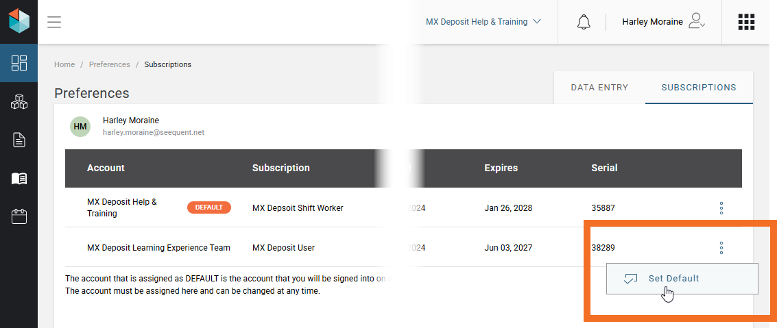 To check which subscription is set at the default, visit app.mxdeposit.net using your web browser and sign in with your Seequent ID. Then: