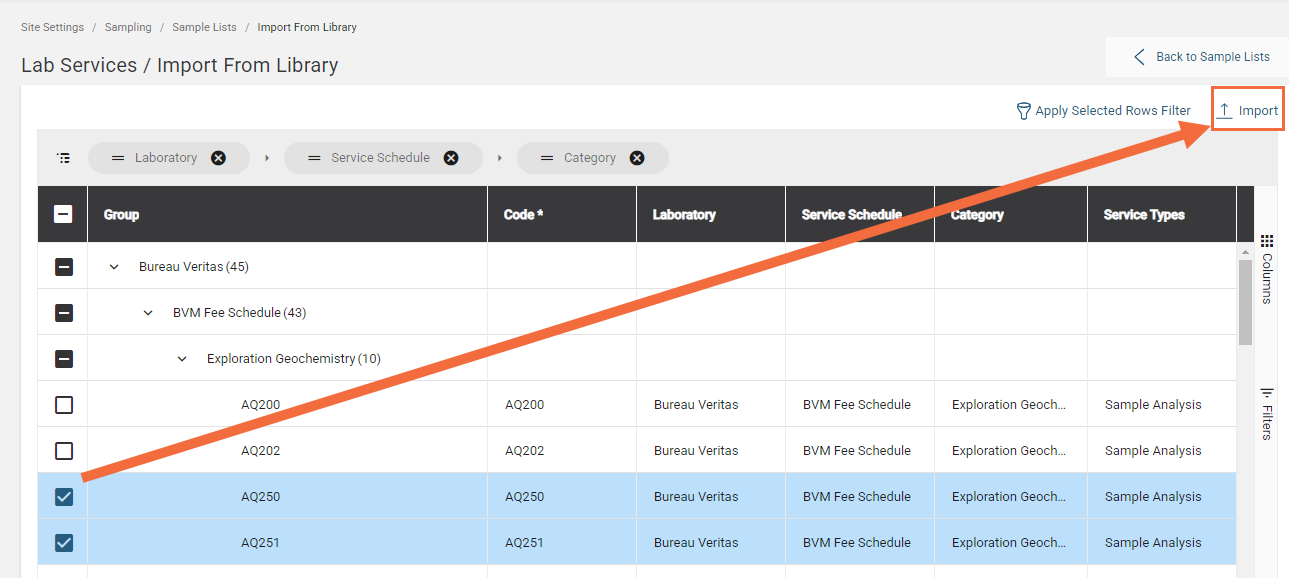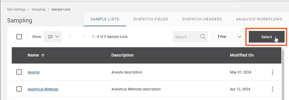 To import lab service protocols, go to Sample Lists and click on Select.