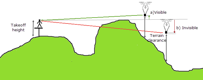 Given the DEM grid, a sortie GDB containing the path and a takeoff/ landing location for each XYZ point in the sortie path, this tool calculates an imaginary 3D straight line to the takeoff/ landing XYZ location (green and red lines in the illustration below). If this line is above the line of sight (dashed grey line), the sensor is visible. If the line is below the line of sight, it will not be visible. On the sortie plan map, the visible expanses are left blank while the areas that are not visible are colour coded according to the vertical distance of the drone from the line of sight (b) red arrow).