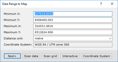 The dialog shows the data range (coordinate extents), units and coordinate system information from the last projection that was used. To change the coordinate system information, you will need to scan an existing database or grid for the coordinate system and coordinate information.