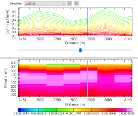 Use the 2D Section Viewer dialog (geogxnet.dll(Geosoft.GX.SectionViewer2D.SectionViewer2DTool;Run)*) to visualize and analyze geophysical data (data points, array data) and voxel sections (e.g., from modelling results) in 2D Model and Profile views.
