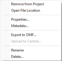• Export to OMF: Opens the Export Project to OMF dialog. The selected geosurface, along with any other grids, voxels, and geosurfaces from your current project, can then be saved as an OMF file.