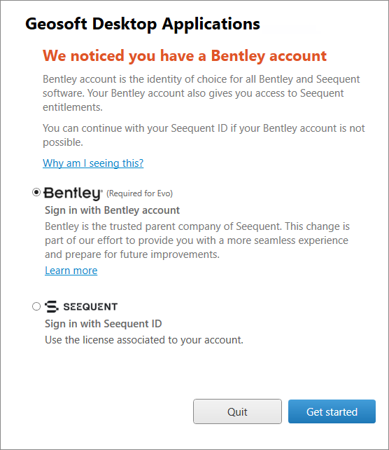 3. If a Bentley account is detected, you may choose to sign in with your Bentley credentials instead. Either method grants access to the entitlements linked to your email.